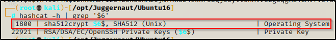 这告诉我们破解模式是 1800。我们还知道哈希是 SHA-512,因为我们之前生成了自己的哈希来编辑影子文件,所以这看起来不错。