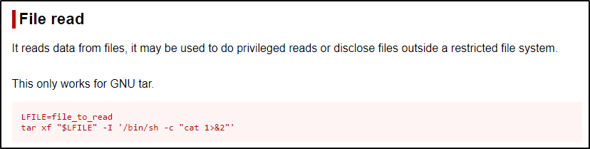 就像我们在 perl 中看到的那样,他们在 tar 命令中使用变量;但是,我们可以将第二个命令中的 $LFILE 替换为我们感兴趣的文件名,例如 root 的 bash 历史文件 - 作为示例。