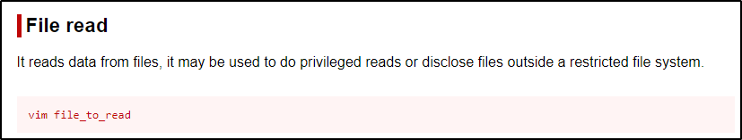 作为特权文件读取的最后一个示例,我们将使用文本编辑器“vim”打开文件并查看其内容。检查 GTFOBins 后,我们会看到以下内容: