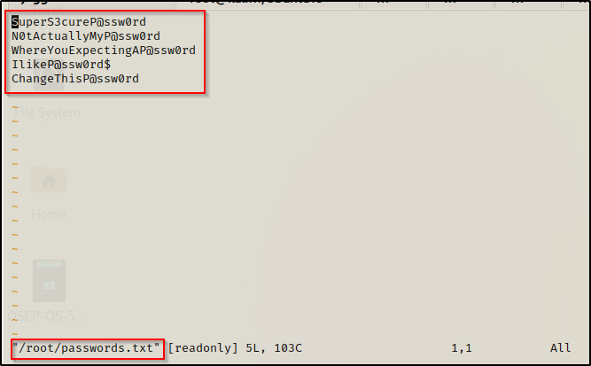 非常简单,我们只需运行 vim 命令,然后运行我们要读取的文件。由于我们在上一个示例中的 /root 目录中发现了一个有趣的文件,名为 passwords.txt,因此让我们检查一下。