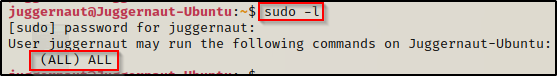 当我们运行 sudo -l 命令时,系统会提示输入密码,成功输入密码后,我们看到当以该用户身份使用 sudo 时,我们拥有作为 root 的完全权限。