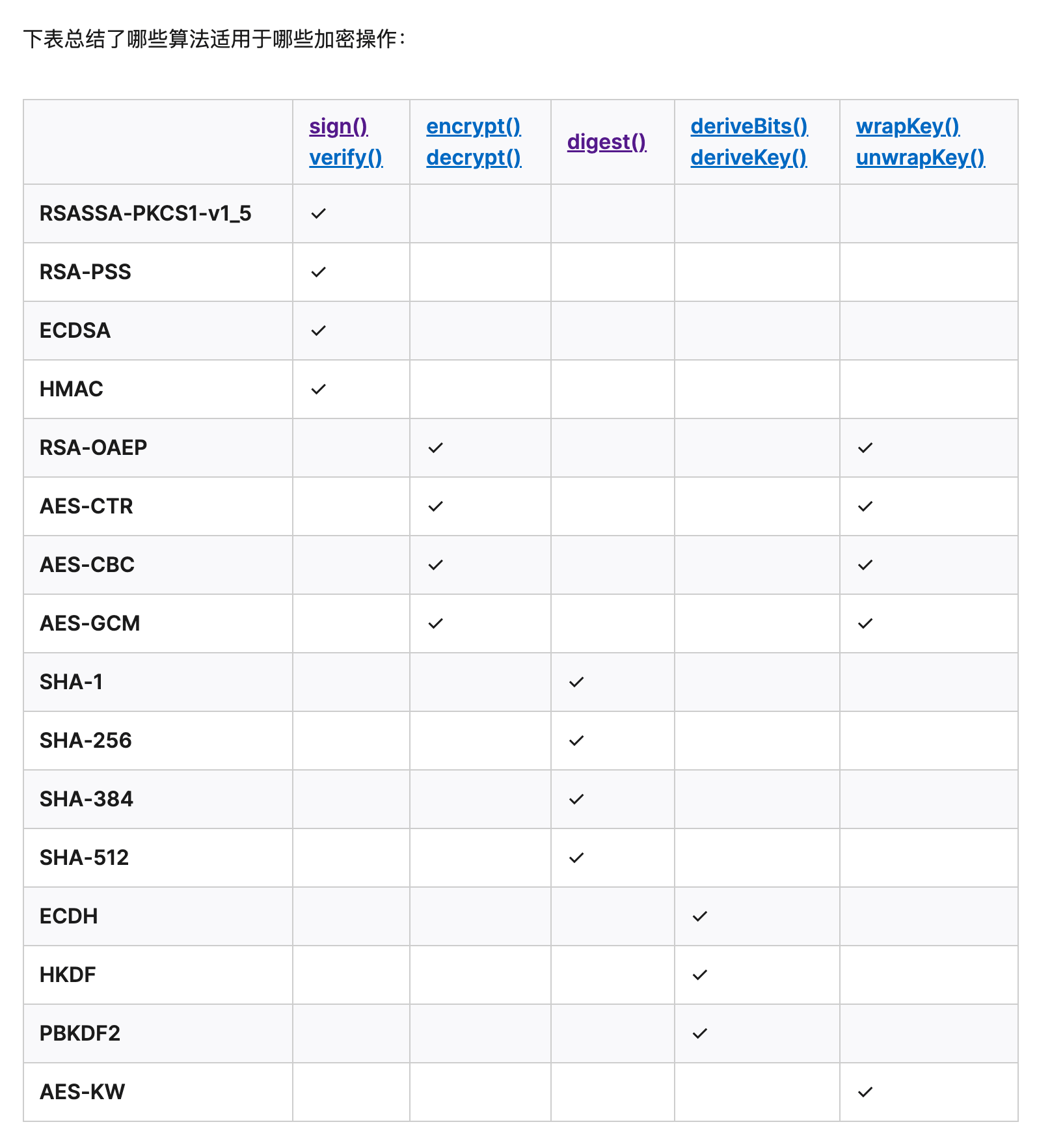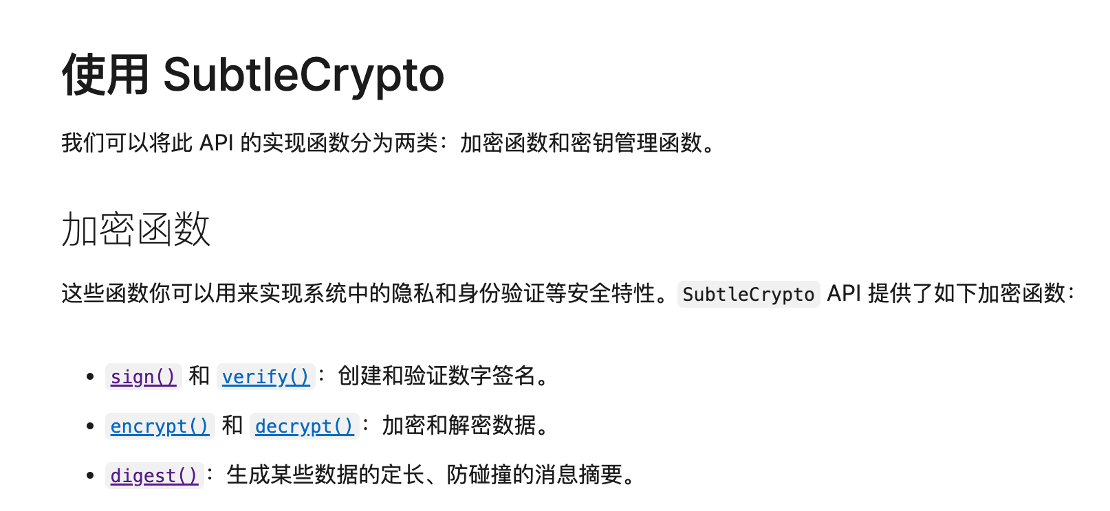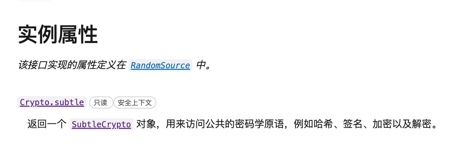 在阅读 MDN: Crypto API 文档时先可以看到 Crypto.subtle 的描述。
