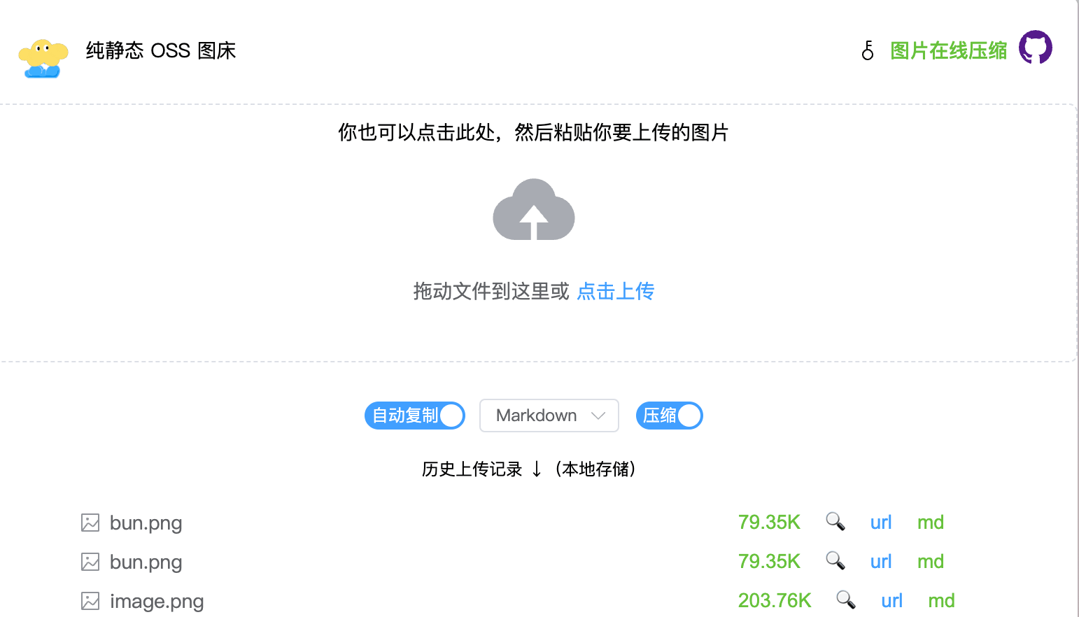 笔者写文章的时候,都会把图片通过自己搭建的一个简单站点 https://imgbed.sugarat.top/ 把图片上传到各种云的对象存储服务(OSS)上。