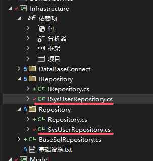 在之前的ISysUserRepository.cs和SysUserRepository.cs中分别继承IRepository.cs 和Repository.cs