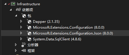 配置好数据库连接之后,我们需要一个读取数据库的类,所以我们需要在基础设施层(Infrastructure)创建。