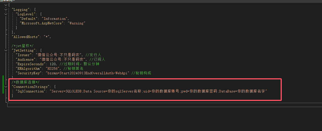 SqlConnection": "Server=SQLOLEDB;Data Source=你的sqlServer名称;uid=你的数据库账号;pwd=你的数据库密码;DataBase=你的数据库名字