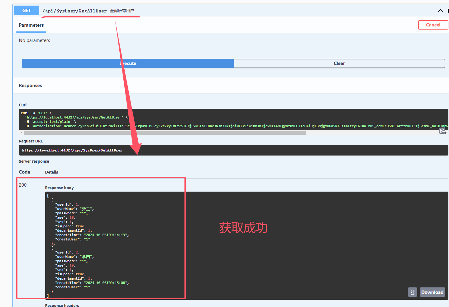 /// <summary> /// 查询所有用户 /// </summary> /// <returns></returns> [HttpGet] public List<SysUser> GetAllUser() { return _userService.GetAllUser(); }