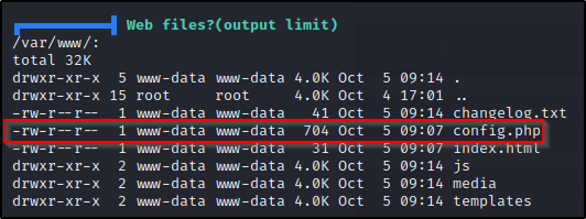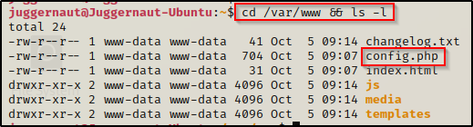 导航到 /var/www/,我们可以看到这里有一些文件,但“config.php”最为突出。
