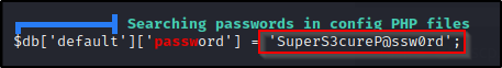 我们通常会找到 MySQL 凭据的第二个地方是 webroot 目录。它通常位于 /var/www,该目录还包含我们在获得立足点之前使用 gobuster 或 dirb 等工具对子目录进行模糊测试时找到的网页。