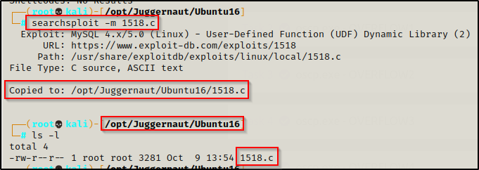 在这里我们看到有两个 UDF 漏洞利用彼此相似。然而,较新的版本包括 MySQL 版本 5.x,也是我们将在此处使用的版本(1518.c)。