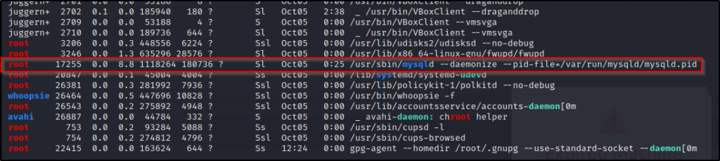 接下来,我们要找出谁是进程所有者(服务以谁的身份运行)。默认情况下,这将是 "mysql" 服务账户,但也可以将其更改为包括 root 用户在内的任何用户。
