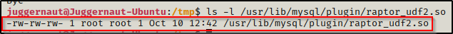 插件文件夹是默认共享对象所在的位置,也是唯一可以从中加载共享对象的文件夹。该文件夹由 root 拥有,但由于MySQL进程以 root 身份运行,所以当我们在 MySQL 内执行命令来移动我们的漏洞利用文件时,这些操作将以 root 身份在实际文件系统上执行,这将允许我们将文件移动到归 root 所属的文件夹。