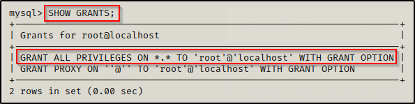 由于我们是MySQL超级用户(root),因此我们应该拥有该帐户的完全访问权限;但是,我们可以使用以下命令确认这一点: