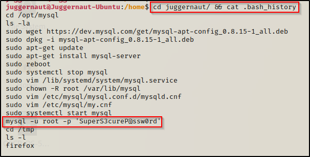BOOM!在 bash 历史文件中,我们可以看到用户尝试直接在命令行上传递完整凭据来登录 MySQL。