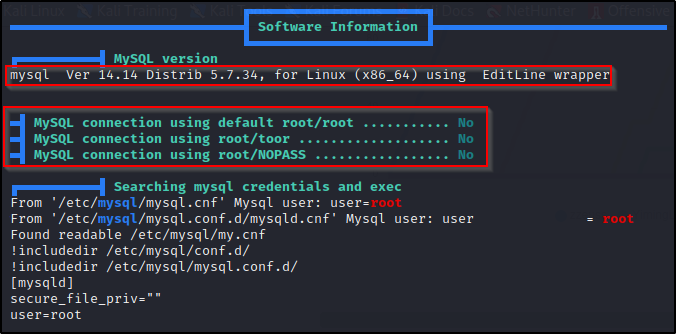 进一步滚动,我们来到 Software Information 部分,在这里我们可以看到正在运行的 MySQL 版本以及 LinPEAS 执行的一些检查,以查看 root 帐户是否使用空白密码或“root”或“toor”作为密码。
