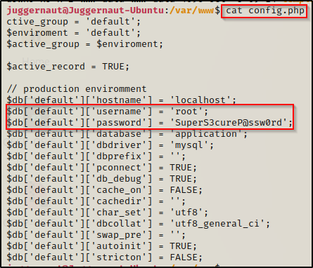 当我们检查该文件时,我们可以看到它用于以 root 身份访问 MySQL 数据库,并显示明文用户名和密码。