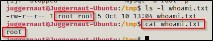 对于 POC,我们可以使用以下命令创建一个 txt 文件,该文件将确认我们以 root 身份执行命令: