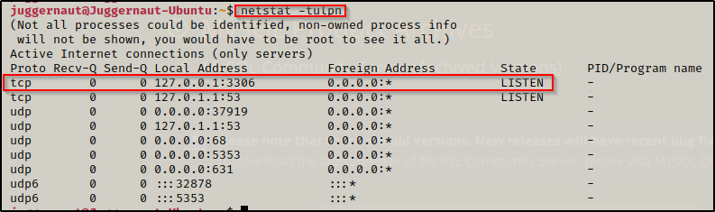 要检查 MySQL 是否正在运行,我们可以使用以下 netstat 命令: