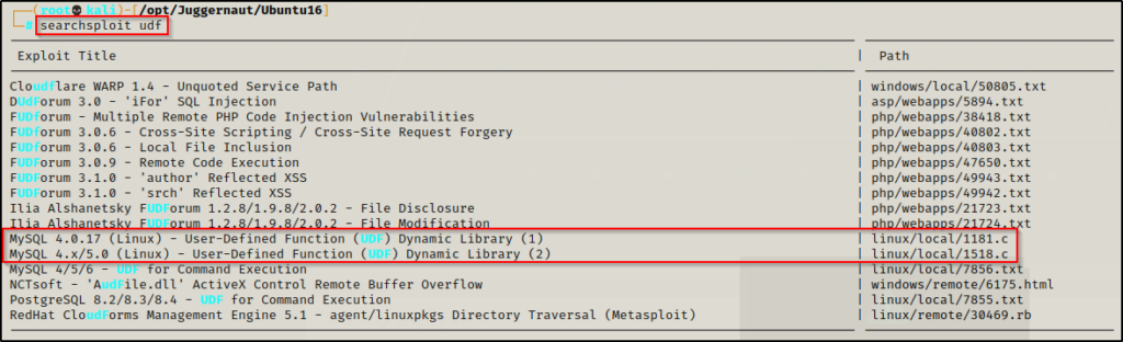 在此示例中,我们将使用 raptor_udf2.c UDF 漏洞利用,可以通过搜索 exploit-db 或 GitHub 找到该漏洞。幸运的是,由于这个漏洞利用在exploit-db上,如果我们使用Kali,那么这个漏洞就已经在我们的系统上。