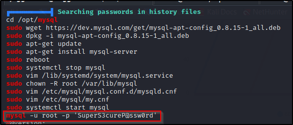 再往下,我们遇到了有趣的历史文件字符串,并且发现了 MySQL 凭据,就像我们在 .bash_history 文件中所做的那样。