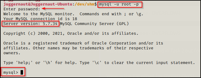 从这个输出中,我们最感兴趣的是“Distrib”编号,在本例中为5.7.34,这对我们来说是个好消息,因为我们将使用的 UDF 漏洞适用于 MySQL / MariaDB 版本 4.X 和 5.X 。