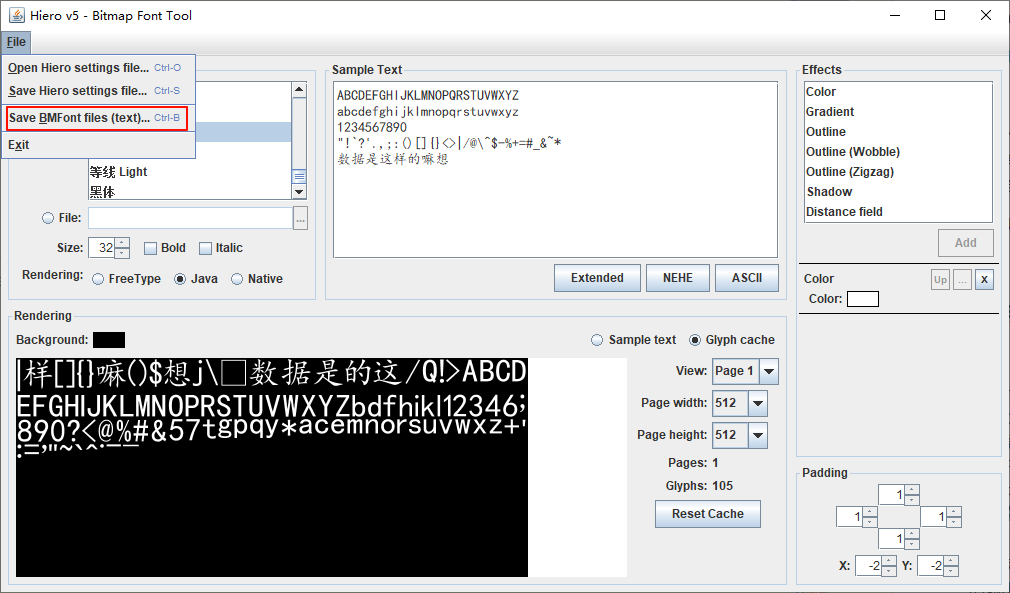 FreeType: 通常质量最高。它充分利用了提示,这意味着小字体可以很好地呈现。该gamma设置控制抗锯齿程度。该mono设置禁用所有字体平滑。不支持其他效果,但可以使用填充和通过 Photoshop 或其他工具应用的效果来渲染字形。Hiero 使用 gdx-freetype,因此生成的位图字体将与 gdx-freetype 即时渲染的字体完全匹配。Java: 此字体渲染为字形提供了矢量轮廓,允许应用各种效果,例如阴影、轮廓等。小尺寸的输出通常很模糊,但大尺寸的输出质量很好。Natvie: 操作系统原生渲染最为简单。它不提供紧密贴合的边界,因此字形会占用更多的图集空间。在右边的输入框中,输入相关文字,点击file菜单栏即可生成fnt文件,如下图所示