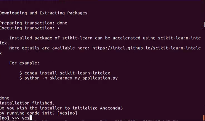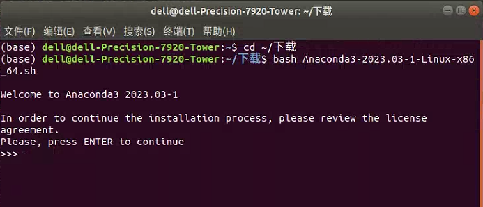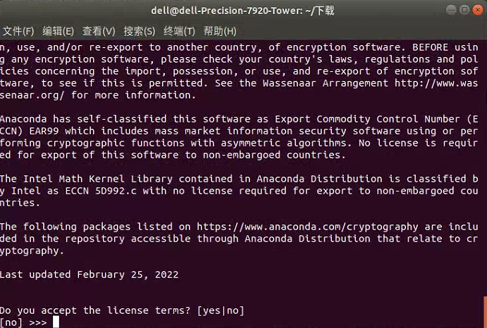 接下来,我们按下一次回车键,开始阅读Anaconda的用户协议;其中,我们需要不断通过回车键向下阅读。直到出现如下图所示的界面后,我们输入yes,从而开始安装。