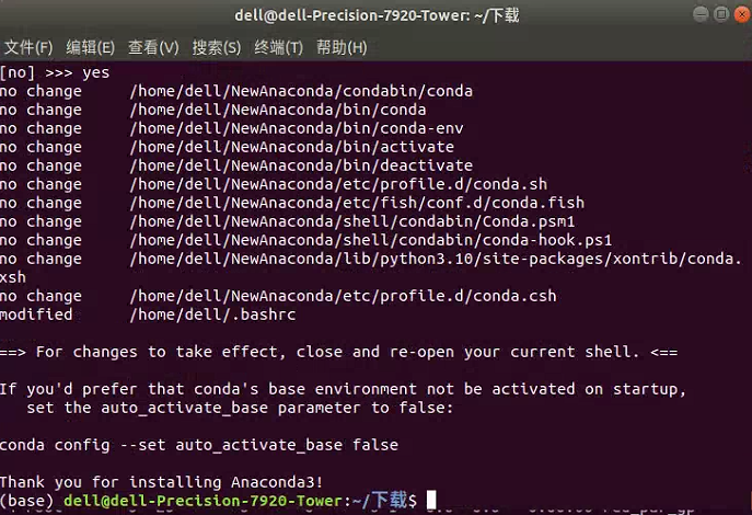 随后,将出现如下图所示的界面,表明我们已经成功安装了Anaconda环境。但此时,我们还需要重启一下当前的终端窗口——将当前终端窗口关闭,随后再打开一次即可。