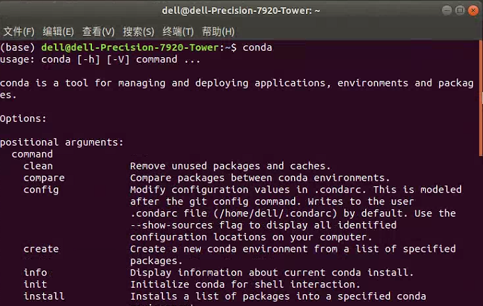 打开新的终端后,我们可以输入conda,查看Anaconda环境的安装情况;如果出现下图所示的界面,表明我们的配置成功。