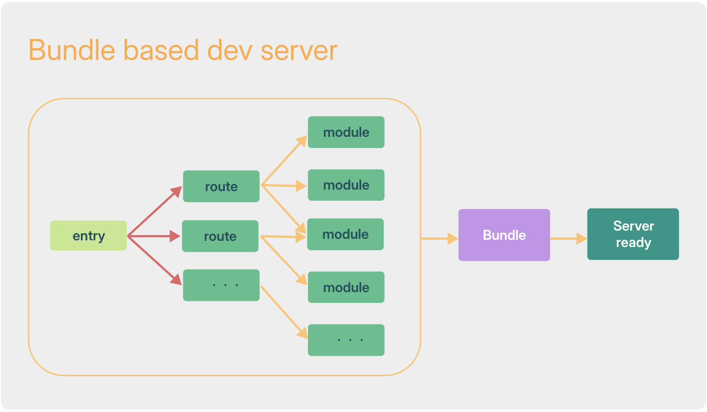 这张图代表的是基于打包器的构建方式(webpack就是其中之一),它在启动服务之前,需要从入口开始扫描整个项目的依赖关系,然后基于依赖关系构建整个应用生成bundle,最后才会启动开发服务器。 这就是这类构建方式为什么慢的原因,并且整个构建时间会随着项目的变大变的越来越长!