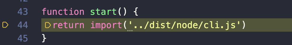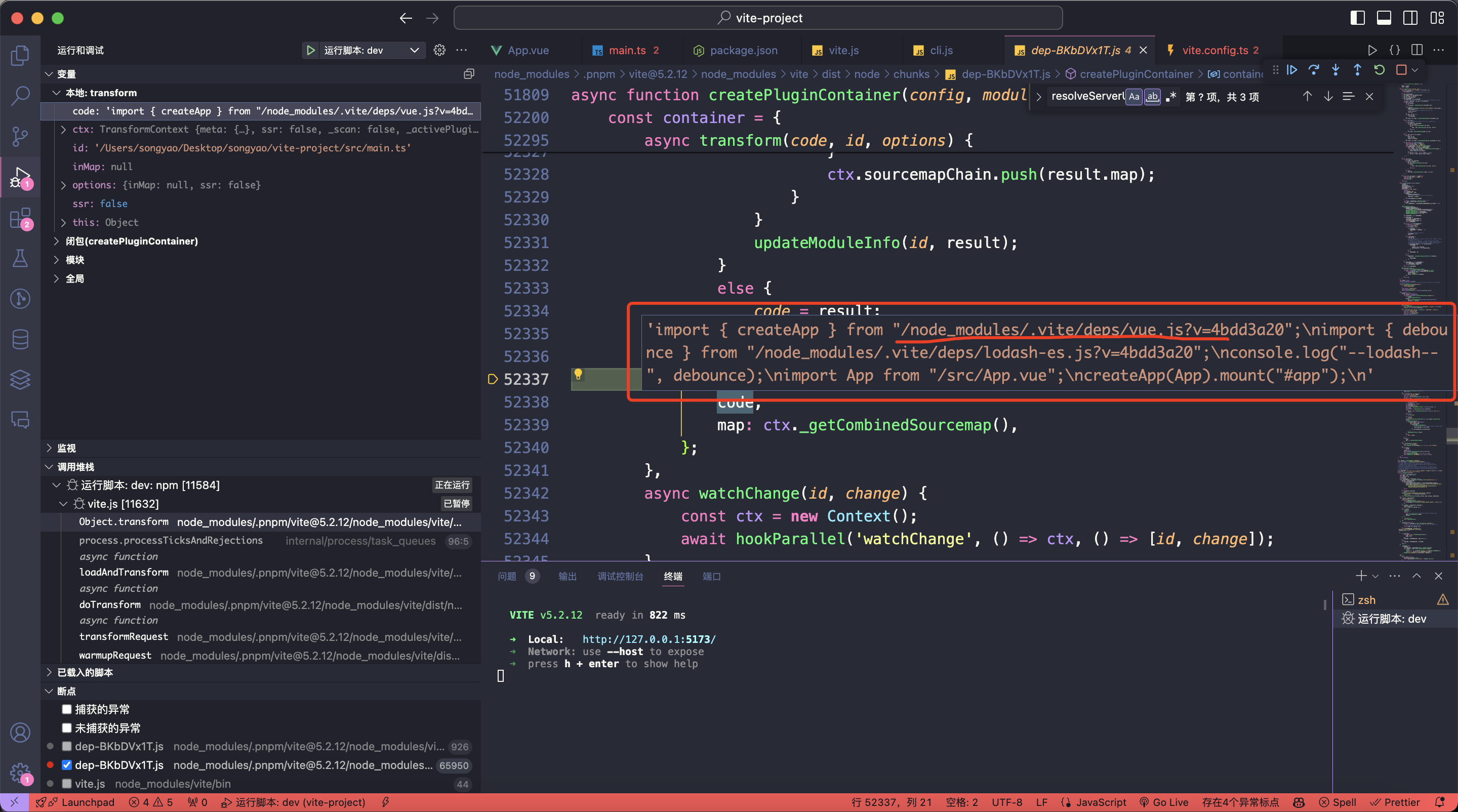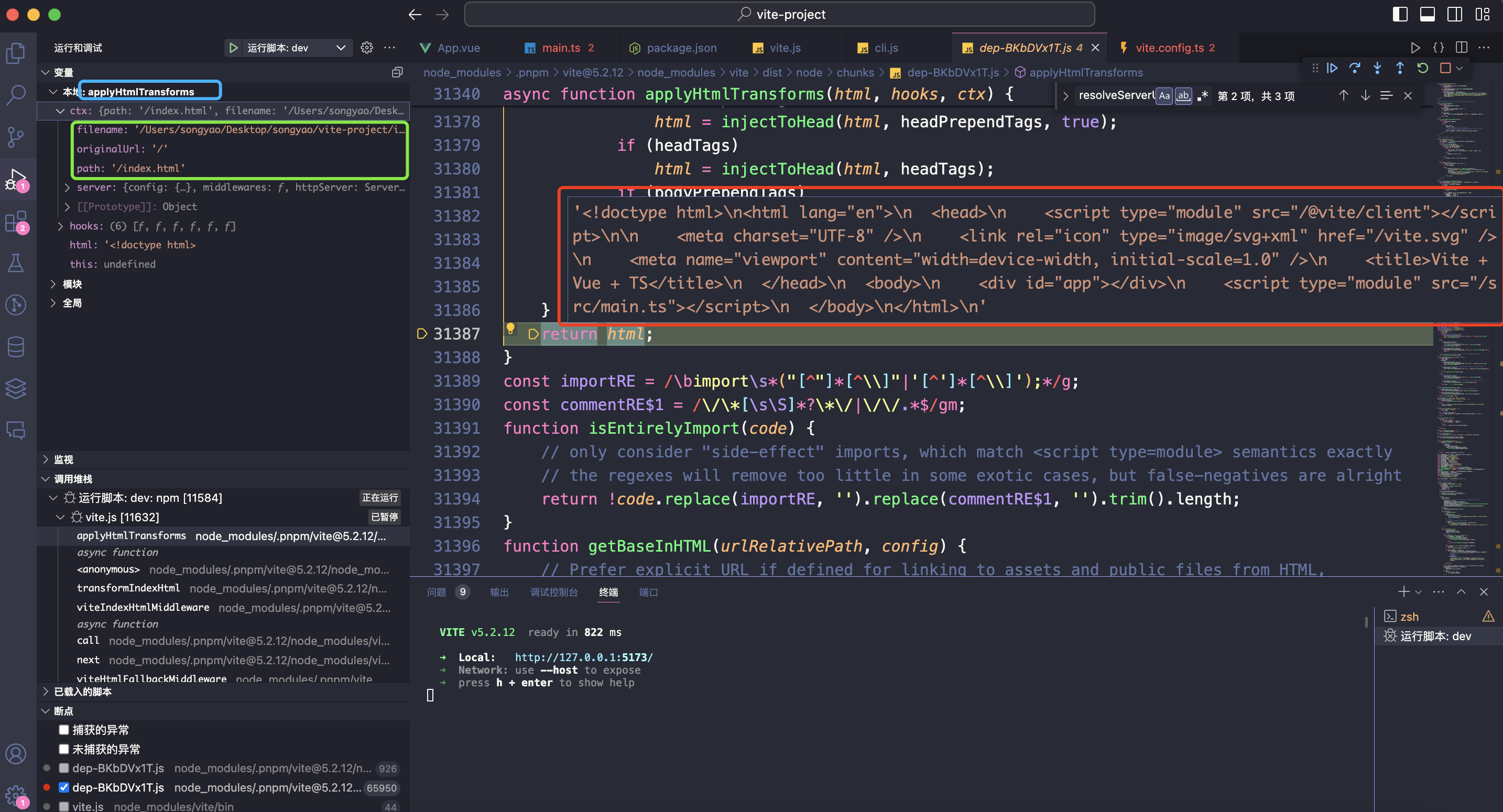 接着往下走,我们可以看到有一个处理url的方法,此时运行栈里面的address变量也能够看到是127.0.0.1:5173,这就是我们等会要访问的本地服务,当然现在浏览器还什么也看不到,因为还没开始处理/路由,该路由需要返回一个html文件,也就是我们的模版文件(项目基于Vue3)