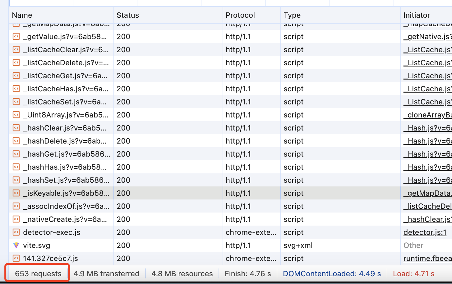 可以看到,此时发起了600多个请求,这是因为lodash-es 有超过 600 个内置模块!