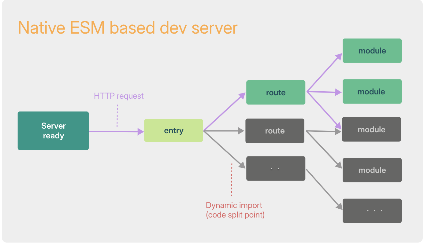 了解到webpack的耗时主要花费在打包上,Vite选择跳过打包,直接以以 原生 ESM 方式提供源码,这样岂不是可以非常快!