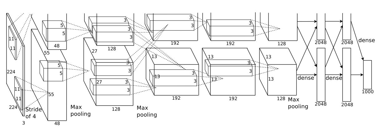 由于这篇文章在提出时没有很好的GPU,估计显存不够?所有采用了双GPU训练的方法。具体来说上下两块GPU分别负责一般的参数,但是这其中也有信息的融合,比如第3、6,7层。其次这里输出的图像维度应该有误,应更正为2252253