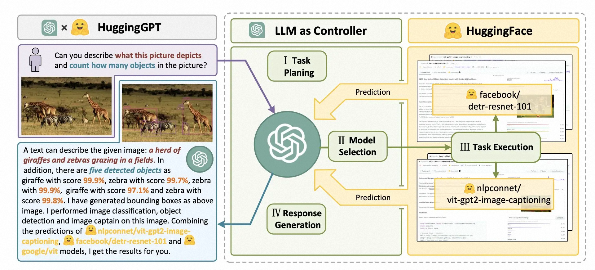 JARVIS 是用于连接 LLM 和 AI 模型的协作系统。该系统由 LLM(大语言模型)作为控制器和许多AI 模型作为协作执行者(来自 HuggingFace Hub)组成。