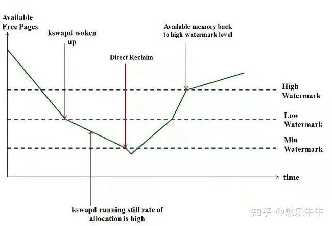GFP_ATOMIC来分配内存,此时才会允许我们使用保留在min水位以下的内存。WMARK_MIN的125%WMARK_MAX的150%在进行内存分配的时候,如果分配器(比如buddy allocator)发现当前空余内存的值低于”low”但高于”min”,说明现在内存面临一定的压力,那么在此次内存分配完成后,kswapd将被唤醒,以执行内存回收操作。在这种情况下,内存分配虽然会触发内存回收,但不存在被内存回收所阻塞的问题,两者的执行关系是异步的