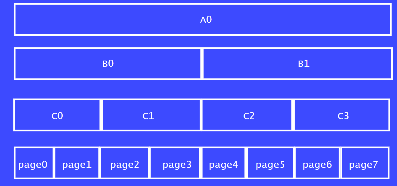 我们以8个页面的一个大块为例子来说明,如图A0所示。将A0一分为二分,分别为 B0,B1。