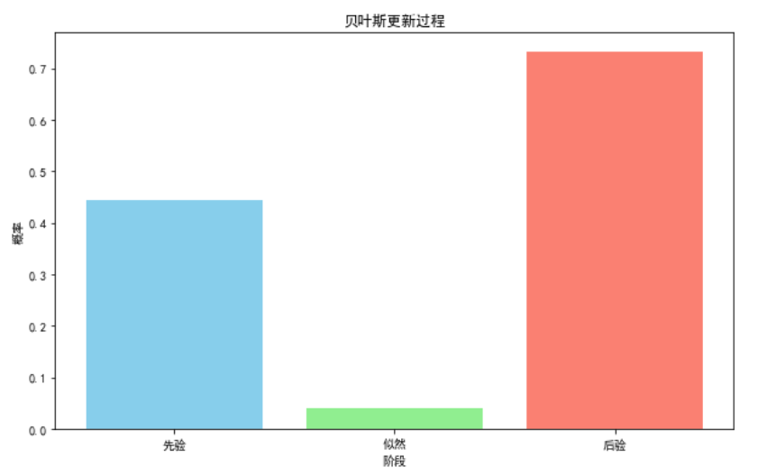 通过这个可视化图表,我们可以清晰地看到贝叶斯更新过程如何结合先验信息和新证据来调整对某个事件的概率估计,从而提供更加合理的决策依据。