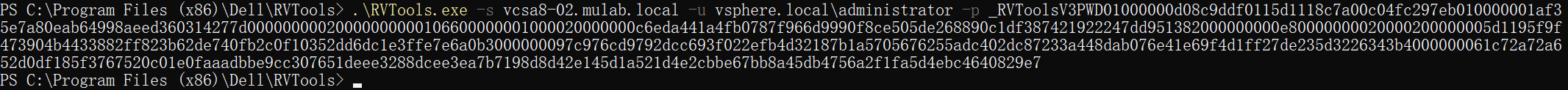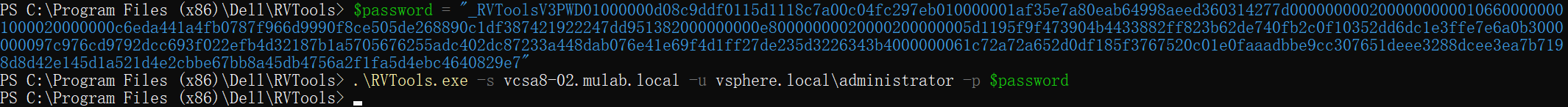 .\RVTools.exe -s vcsa8-02.mulab.local -u vsphere.local\administrator -p _RVToolsV3PWD01000000d08c9ddf0115d1118c7a00c04fc297eb010000001af35e7a80eab64998aeed360314277d00000000020000000000106600000001000020000000c6eda441a4fb0787f966d9990f8ce505de268890c1df387421922247dd951382000000000e80000000020000200000005d1195f9f473904b4433882ff823b62de740fb2c0f10352dd6dc1e3ffe7e6a0b3000000097c976cd9792dcc693f022efb4d32187b1a5705676255adc402dc87233a448dab076e41e69f4d1ff27de235d3226343b4000000061c72a72a652d0df185f3767520c01e0faaadbbe9cc307651deee3288dcee3ea7b7198d8d42e145d1a521d4e2cbbe67bb8a45db4756a2f1fa5d4ebc4640829e7
