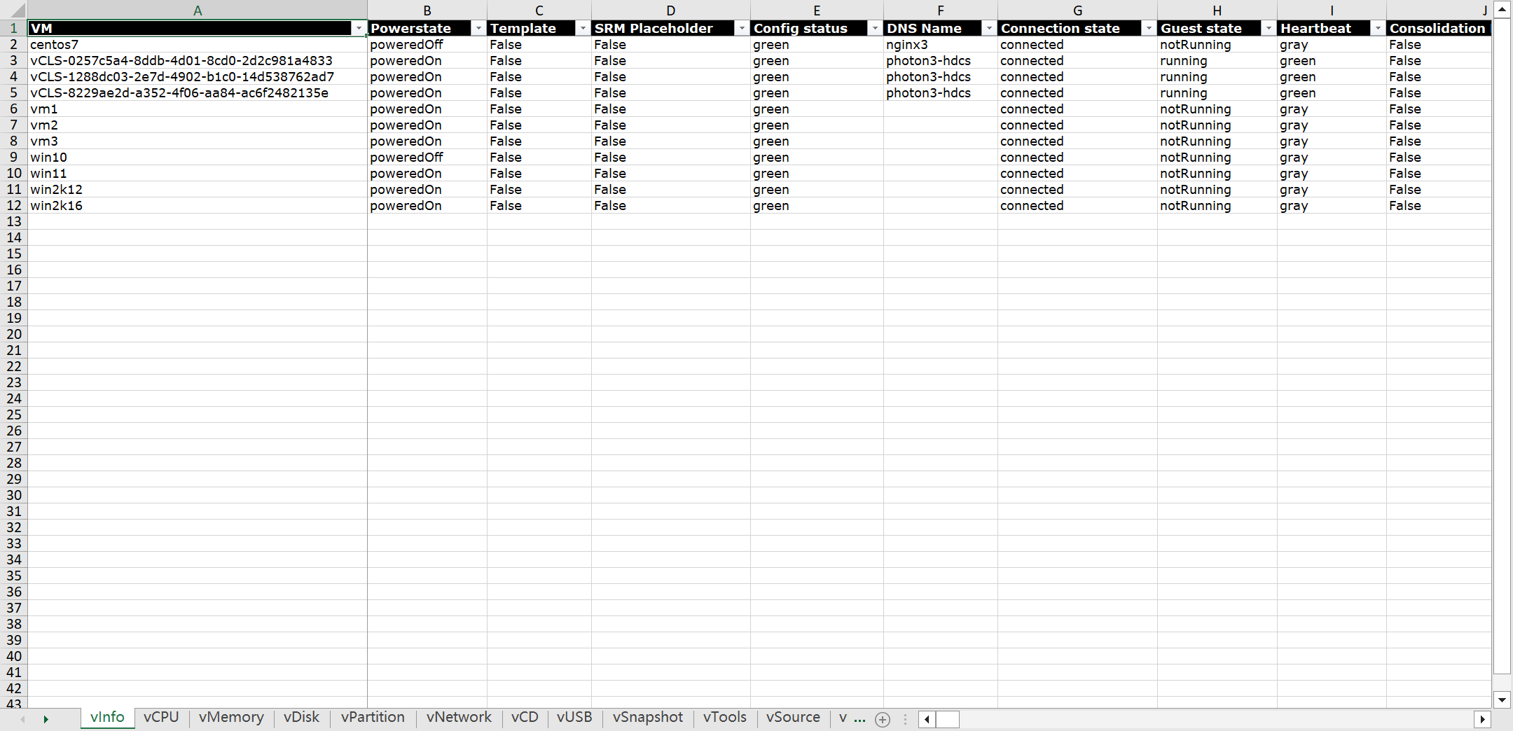 运行 RVTools 命令使用 ExportvInfo2csv 导出选项将 vInfo 选项卡以 CSV 格式导出到指定目录,使用 -f 选项指定导出文件的名称,不指定则导出带有时间戳的文件名。