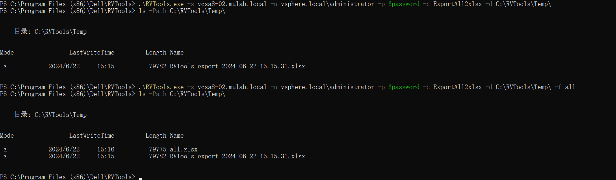 .\RVTools.exe -s vcsa8-02.mulab.local -u vsphere.local\administrator -p $password -c ExportAll2csv -d C:\RVTools\Temp\