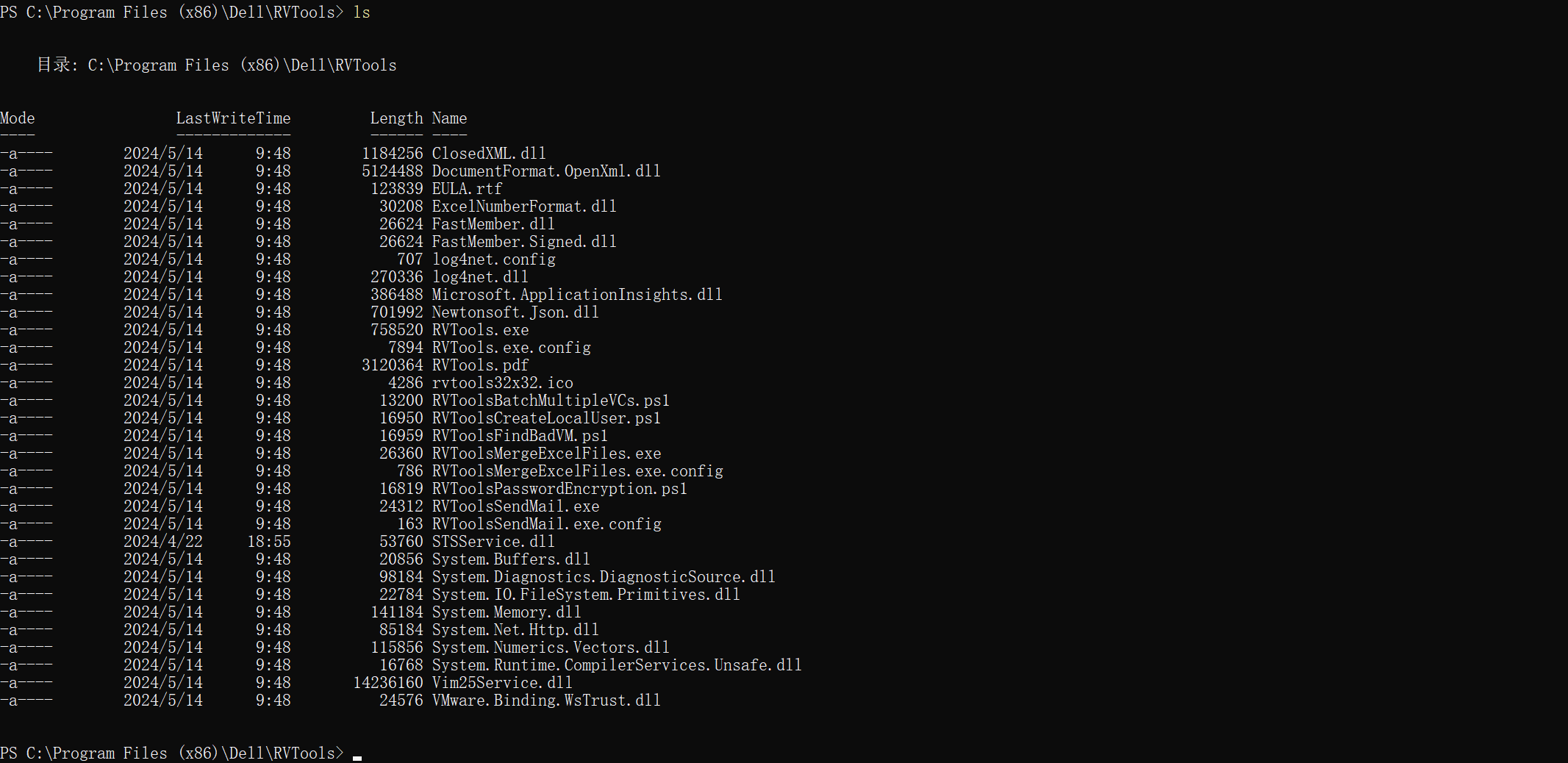 我后面就不再使用文件资源管理器进行查看,全部通过 PowerShell 查看,你可以打开 PowerShell 使用下面命令进入到 RVTools 的安装文件夹。