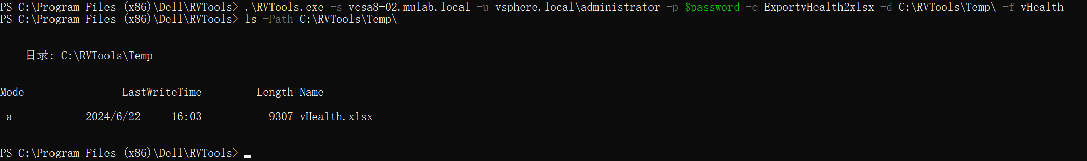 .\RVTools.exe -s vcsa8-02.mulab.local -u vsphere.local\administrator -p $password -c ExportAll2xlsx -d C:\RVTools\Temp\ -f all