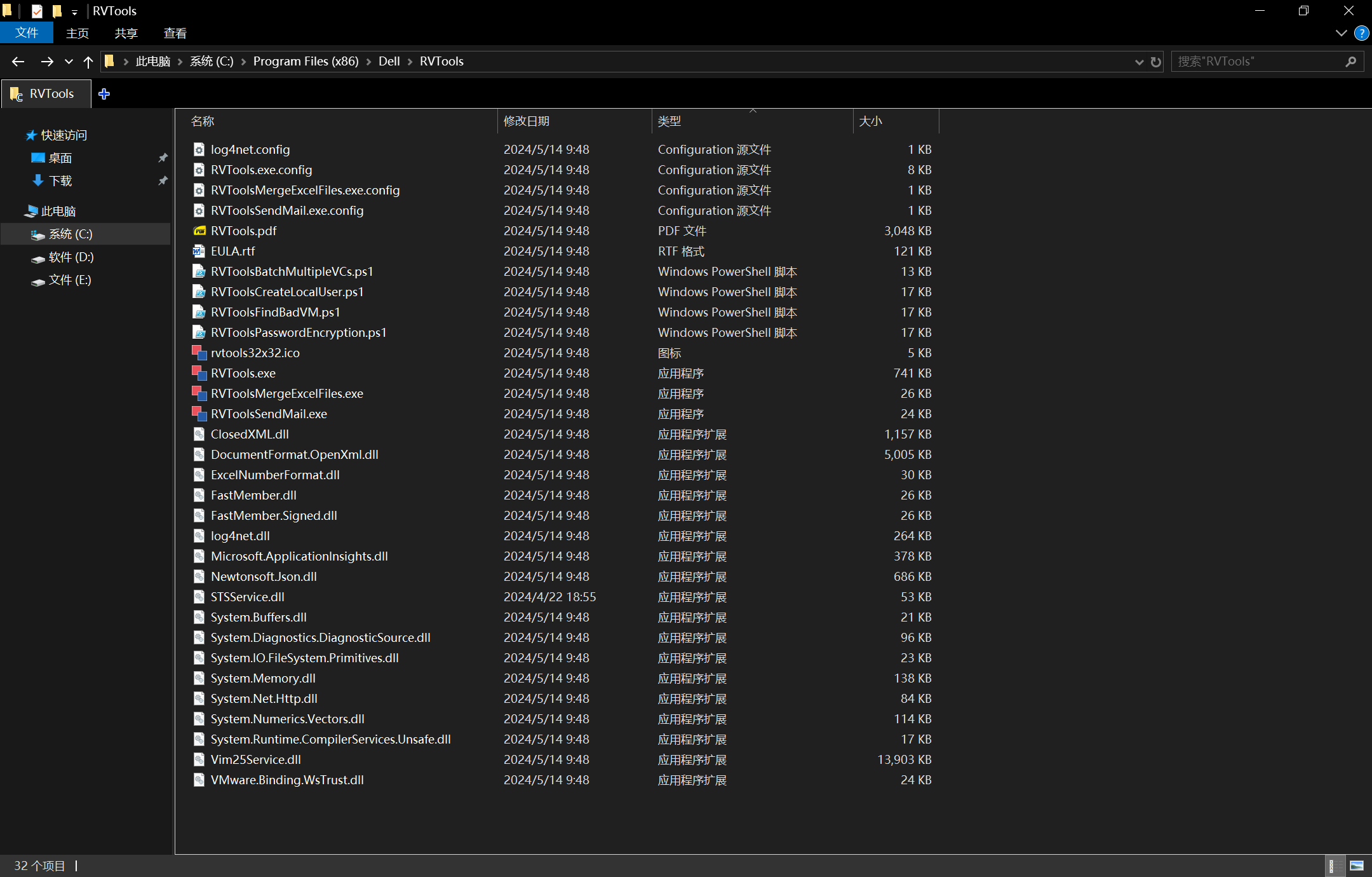 RVTools 当前最新版本为 RVTools 4.6.1,支持 vSphere 5.x、6.x、7.x、8.x 版本,Windows 安装环境需要 .NET 4.6.2 支持。RVTools 默认安装在“C:\Program Files (x86)\Dell\RVTools”文件夹,如果是自定义安装那找到自行设置的文件夹即可,打开文件资源管理器导航到该文件夹后可以看到如下图内容。